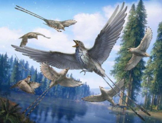 羽毛一度是鸟类的专属,直到批羽恐龙的出现才颠覆了这个定式。不同形态的羽毛赋予恐龙和鸟儿不同的功能。化石记录中最精妙的羽毛要数那些长长的尾羽。这些尾羽绝大多数出现在一些原始的鸟类身上,如孔子鸟类、反鸟类,也出现在恐龙中的擅攀鸟龙类的耀龙尾巴上。这些长且花哨的尾羽在许多情况下都与动物的身体差不多长,这些尾羽与不是为了身体平衡或者飞行,因为其构造并不符合空气动力学要求。那么它们的功能是什么呢?多数古生学家目前认为这是动物种内信息交流的工具,主要功能是求偶炫耀、物种识别和视觉沟通等。