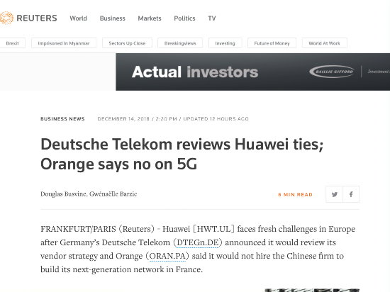 路透社14日一篇题为Deutsche Telekom reviews Huawei ties; Orange says no on 5G (德国电信重新审视和华为的关系;法国电信Orange说在5G方面不会考虑华为)的文章称,考虑到美国的盟友国家由于安全考虑都纷纷将华为的5G技术排除在外,法国和德国的公司也在考虑改变他们与中国公司的合作策略。