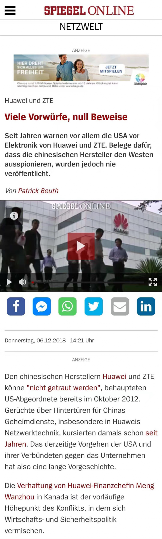 此前,德国媒体也发表过类似的文章来质疑多国对中国技术和设备的猜测毫无凭证。德国《明镜》周刊列了诸多美国对于华为和中兴的猜疑,并且对比公开的证据,指出美政府行为无合法性,并指出,相比美国联盟国家(英澳加)等对于华为运营业务的诸多限制,德国各大电信企业均表示过首先德国政府无权干预决策,其次电信设备安全检测最重要,设备源产地并不是决定因素。