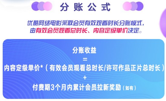 根据优酷公布的新分账公式,片方分账收益=内容定级单价×(有效会员观看总时长/许可作品正片总时长)+付费期3个月内累计会员拉新奖励(如有)。新规则延续了观看时长、拉新奖励两项指标,继续鼓励片方以用户为导向创作。而网络电影的定级将从播后改为播前,从依照播放量定级改为人工评审,力图充分鼓励网络电影的类型多元化和题材创新,给这些内容更为公平的价值评判。与此同时,播放量评估将内化到人工评审环节中,即评估过程也将参考历史上同类影片的市场表现。