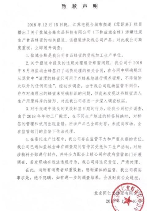 北京同仁堂蜂业有限公司的致歉声明。 截屏图
