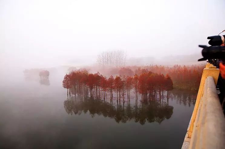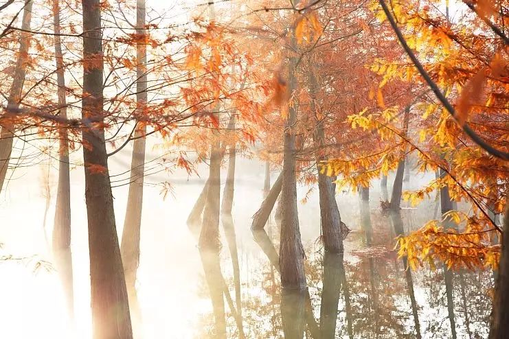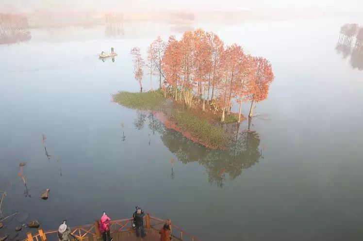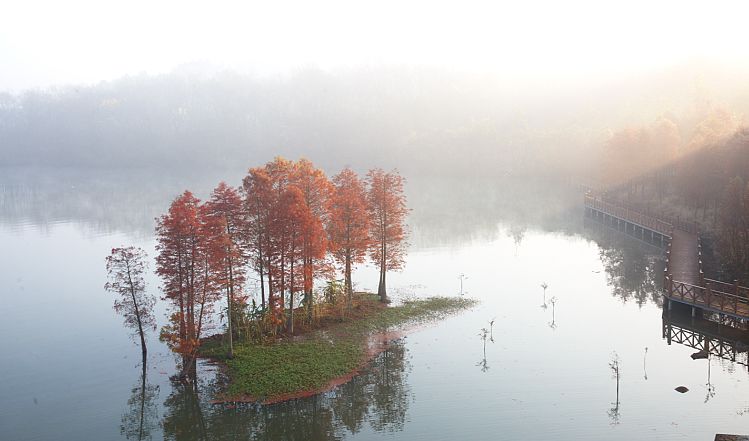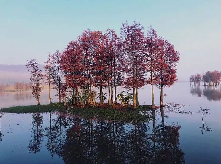 来到天泉湖,就会发现,除了碧波荡漾的湖水、烟波缥缈的晨雾,美丽的红杉绝对是天泉湖的一大亮点!一棵棵鲜艳的红杉挺立于湖水之中,蔚然成片,“水上森林”名不虚传!