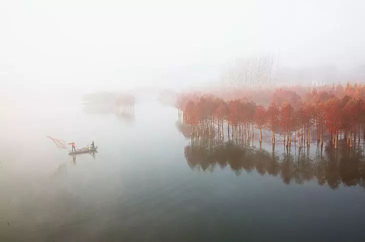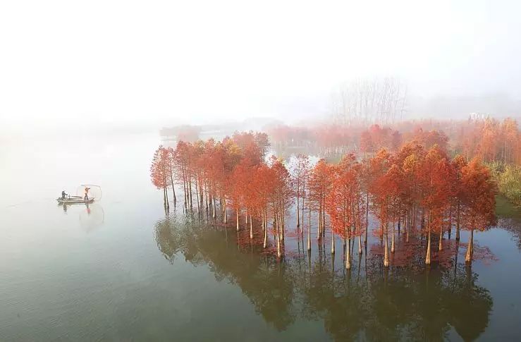 茂密的红杉错落有致地分布在湖中的不同区域,绘成一幅美不胜收的湖景图,给冬日的天泉湖增添了艳丽的色彩,吸引大家的目光!有渔民划船行驶在天泉湖上,穿行于一片片红杉林中,荡起圈圈涟漪,让天泉湖在静态美之余又多了一份动态的灵动。