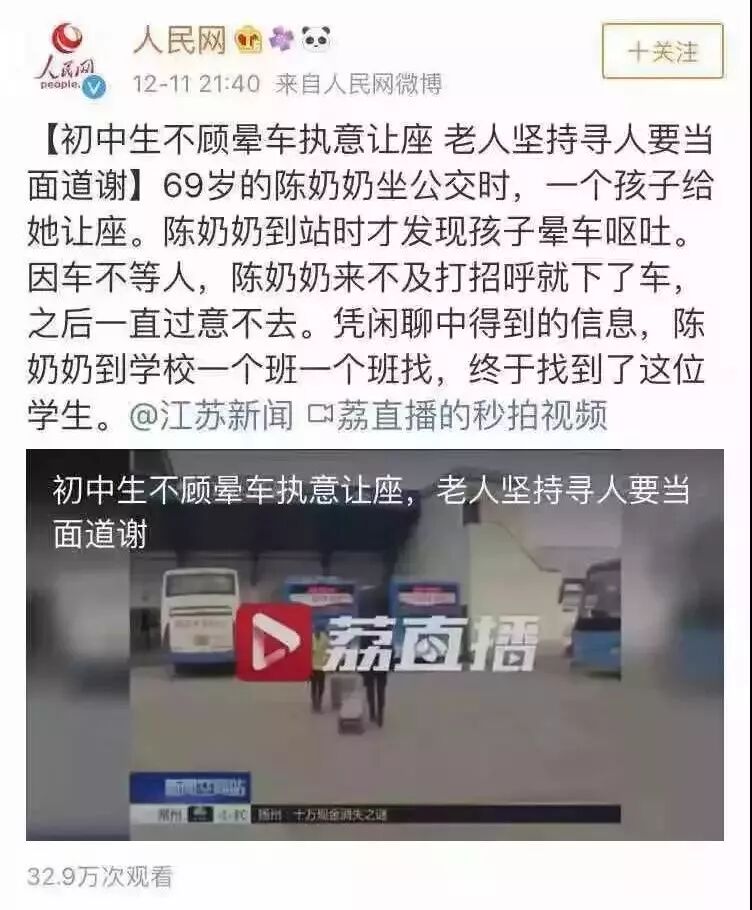 12月11号,《直播淮安》栏目报道了淮安市北京路中学初一男生桂天生自己晕车还执意给老人让座的新闻。节目播出后,大家纷纷为这位好少年点赞。