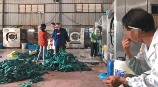 一名工作人员称,他们长期这样工作,所谓的消毒只是在洗衣机内加上84消毒液,没有高温消毒环节。