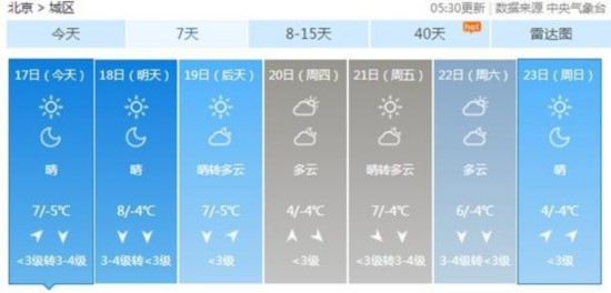 今明天以晴到多云为主,气温较前期明显回升。北京市气象台预计,今天白天晴,北转南风2、3级,最高气温7℃;夜间晴,南转北风2、3间4级,最低气温-5℃。明天最高气温继续升至8℃;最低气温升至-4℃。天干物燥,注意补水润燥,也需注意用火用电安全。气温回升,昼夜温差加大,需谨防着凉感冒。