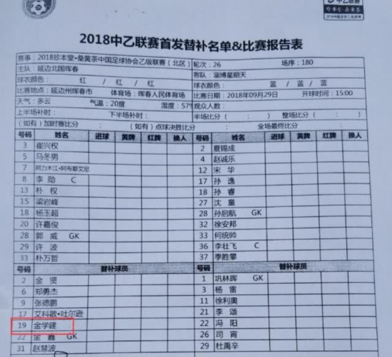 延边北国是一支中乙球队,在2018赛季中乙常规赛中排名北区第12。翻看延边队的比赛报名名单不难发现,该队投资人金学建经常出现在球队的替补名单中,并且在中乙赛场甚至足协杯都有过出场记录。