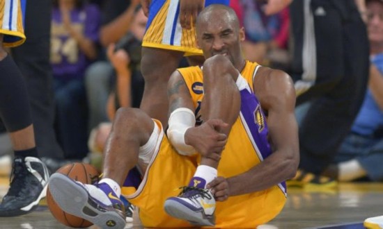 连续7场比赛,科比高负荷运转,场场打至少41分钟以上,打开拓者甚至拼满48分钟,为了赢球、进季后赛,科比赌上了自己的健康。2013年4月13日,湖人同勇士一战,科比又全力战斗了44分54秒。终于,科比的身体支撑不住了,比赛结束前不到4分钟,科比在突破中轰然倒地,那一刻,谁也不知道科比遭遇的竟然是跟腱断裂的重伤。