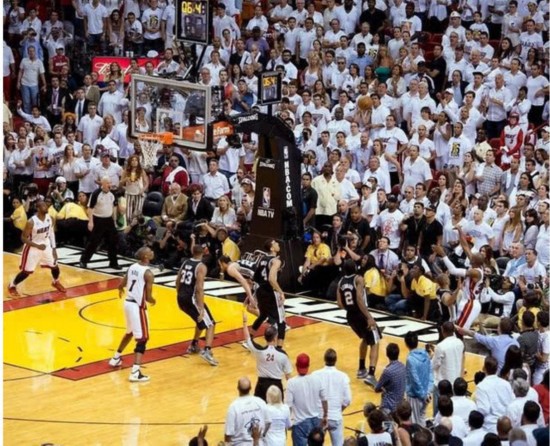 2013年总决赛第六场,常规时间结束前11秒,热火92-95落后3分,詹姆斯左侧侧翼三分不中,热火主场球迷的心跌到了谷底,这个球不进意味着热火的总冠军梦悬了。当时,现场工作人员甚至已经在准备布置总冠军奖杯颁奖典礼。