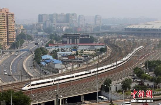 2018年7月1日,中国自行研制的全球最长高铁列车——16辆长编组“复兴号”正式上线运营。图为“复兴号”驶出北京南站。中新社记者 卞正锋 摄