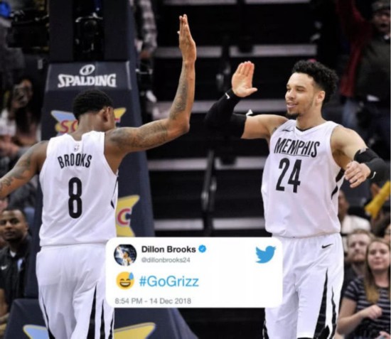 当事人狄龙-布鲁克斯都通过社 交媒体表达了自己无可奈何的标签,他附上了一个“汗”的emoji表情,顺便还加 上了一个“冲啊,灰熊”的标签。