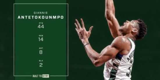 在击败骑士的 比赛中,字母哥拿下了平生涯纪录的44分。