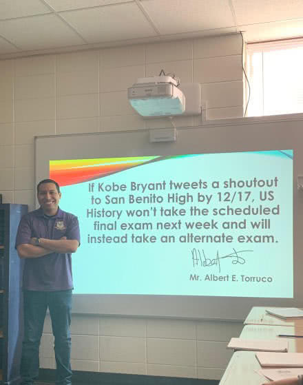 美国一所高中历史老师说:“如果科比能在12月17号之前发推提到我们高中,那么原定于下周的期末考就先不考了,后面再来补考。”