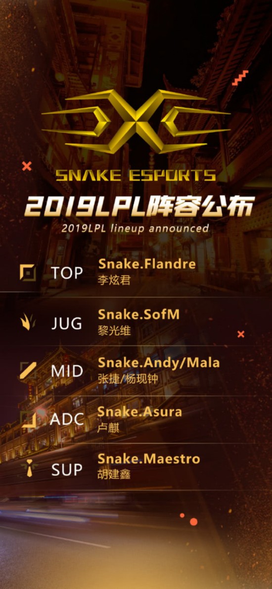 腾讯体育讯 北京时间12月17日,Snake电子竞技俱乐部2019年LPL人员名单官宣,前WD中单Andy、韩国籍选手Mala、前ME战队ADC Asura加盟。即将征战2019年LPL的阵容包括:上单Flandre、打野SofM、中单Andy和Mala、ADC选手Asura以及辅助Maestro。