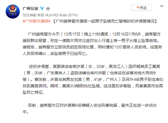 (原标题:广州越秀警方通报一起男子坠楼死亡警情的初步调查情况)
