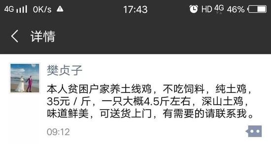 当天,樊贞子到结对帮扶的大椿乡船舱村村民游承自家走访,并在朋友圈发文,帮助游承自推销土鸡。75岁的游承自一人独居,他告诉记者,今年自己在樊贞子的帮助下,散养了50只土鸡。此前,樊贞子多次帮助他寻找销路,这次上门,就帮预订顾客购买了3只土鸡,还嘱咐他天冷了,注意保暖。
