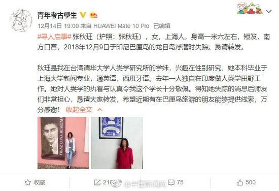 12月15日晚,上海的张先生告诉记者,他正在读研的女儿张秋珏在印度尼西亚失联。张秋珏的同学说,张秋珏12月7日最后一条发布的朋友圈定位在印尼巴厘岛。