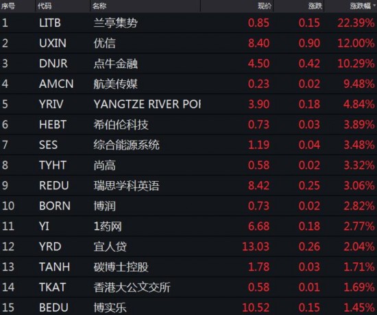 中概股多数收低,阿里巴巴跌3.37%,京东跌3.7%,百度跌4.33%;蘑菇街跌17.02%,虎牙直播跌10.38%,欢聚时代跌9.1%,蔚来汽车跌8.7%,微博跌5.87%,拼多多跌3.98%,网易跌3.79%;兰亭集势涨22.39%,领涨中概股,优信涨12%。(中新经纬APP)