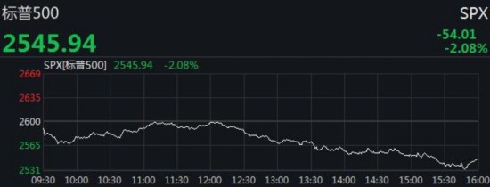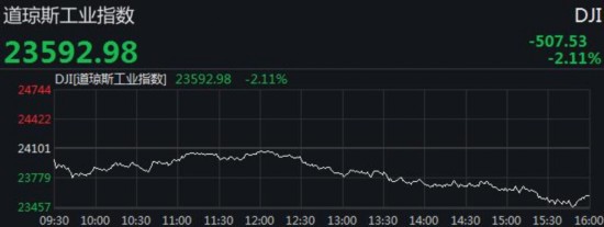 截至收盘,标普500指数收跌54.01点,跌幅2.08%,报2545.94点。道琼斯工业平均指数收跌507.53点,跌幅2.11%,报23592.98点。纳斯达克综合指数跌156.93点,跌幅2.27%,报6753.73点。