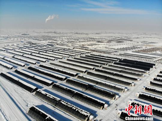 图为12月8日,酒泉戈壁滩上一座座现代化的日光温室大棚,整齐排列着嵌入周边皑皑白雪中,高空俯瞰尤为壮观。 杨艳敏 摄