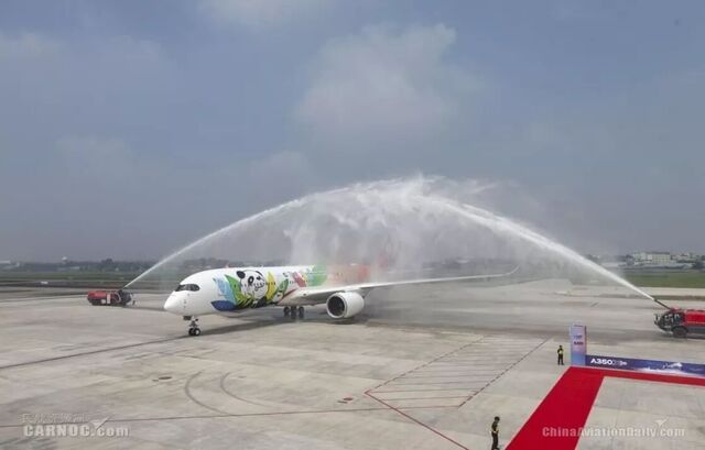 图:2018年8月9日,川航首架A350客机到达成都机场双流机场飞机身披“熊猫”彩绘涂装