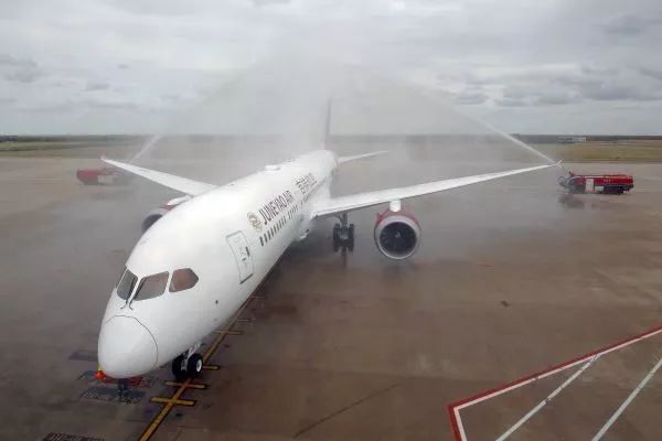 图:9月22日上海航空首架787-9飞机降落上海虹桥机场,这也是上海航空接收的第100架飞机