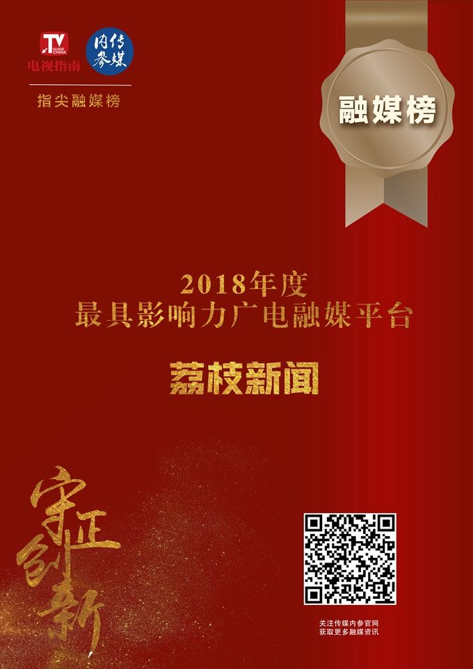 12月18日,由国家广播电视总局《电视指南》杂志、传媒内参联合举办,中国广播电影电视社会组织联合会指导的“第三届指尖移动影响力高峰论坛暨指尖综艺榜·指尖剧集榜·指尖融媒榜发布会”在京举办,并首次发布“2018指尖融媒榜”——2018年度最具影响力广电融媒体平台十强,含江苏广电旗下荔枝新闻在内的全国十家媒体入选。