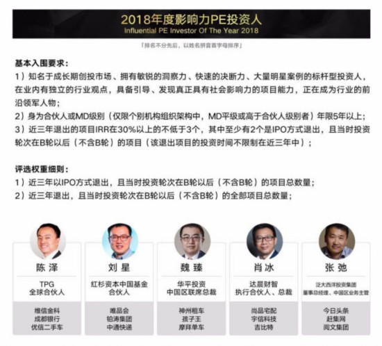 腾讯科技讯 北京时间2018年12月18日,第三届华兴资本集团「VC/PE影响力投资榜单」评选结果在京揭晓。颁奖盛典当晚,华兴资本集团董事长兼首席执行官包凡先生、红杉资本中国基金合伙人周逵、华平投资中国区联席总裁魏臻、经纬中国创始管理合伙人徐传陞、洪泰基金创始合伙人、洪泰资本控股董事长盛希泰、顺为资本创始合伙人许达来、金沙江创投董事总经理朱啸虎、愉悦资本创始及执行合伙人刘二海、源码资本创始合伙人曹毅、高榕资本创始合伙人张震、华兴新经济基金管理合伙人杜永波、华兴资本董事总经理&华兴Alpha负责人周翔、华兴资本顾问业务主管王力行及众多入围榜单的顶尖投资机构创始人、合伙人齐聚一堂,盘点2018年投资业绩,梳理行业现状,展望行业未来。