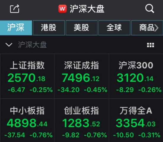 12月19日电 周三沪深两市低开,盘初小幅反弹后持续下挫。截至午间收盘,沪指报2570.18点,跌0.25%,成交483亿元;深成指报7496.12点,跌0.45%,成交658亿元;创业板指报1283.52点,跌0.76%,成交212亿元。