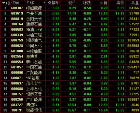 盘面上,受国际油价暴跌拖累,石油股早盘重挫,海越能源、中曼石油、中油工程、本肯能源、中海油服等多股走低。消息面上,美东时间周二,国际原油市场再度大跌,美国原油期货劲跌逾7%,为连续第三日下跌,创逾15个月低点;国内原油期货追随跌势,截至午间收盘跌逾5%。