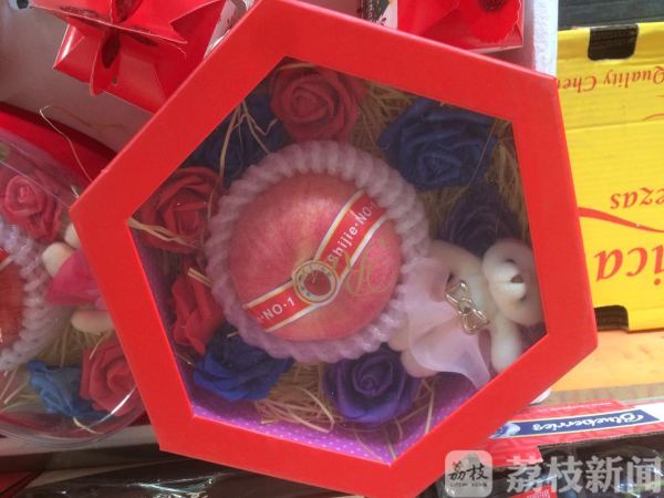 一只“平安果”套只圣诞袋,价格15.80元。一只礼盒,中间放一只“平安果”,周围摆几朵花,放一只小熊,标价88:00元 。据商贩介绍,圣诞节销售“平安果”已经成为惯例,因为生意过于火爆,他们时常要提前一周做准备。