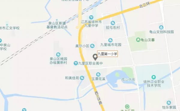 九里第一小学(九里山小学)位于九里山西路北侧、三环西路东侧,用地面积48995平方米,总建筑面积25542平方米,建筑密度15%,绿地率35%,办学规模8轨48个班。