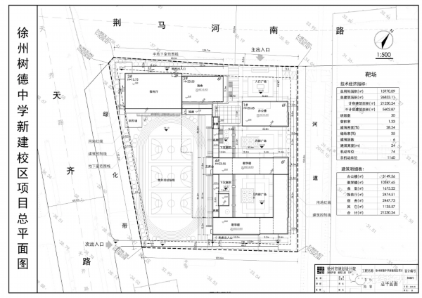 徐州市树德中学位于天齐路以东,荆马河南路以西,用地面积15970平方米,用地性质为中小学用地,总建筑面积26833平方米,容积率1.33,建筑密度28.24%,绿地率35%。