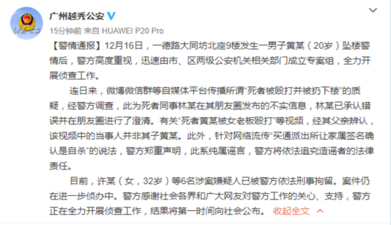 新京报快讯 据广州越秀公安微博消息,12月16日,一德路大同坊北座9楼发生一男子黄某(20岁)坠楼警情后,警方高度重视,迅速由市、区两级公安机关相关部门成立专案组,全力开展侦查工作。