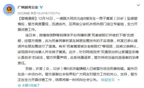 中新网12月19日电 12月16日,广州市越秀区一男子黄某坠楼,网上流传有“死者被殴打并被扔下楼”、“死者黄某被女老板殴打”、“买通派出所让家属签名确认是自杀”等说法。广州市越秀区公安分局今日在官方微博称,以上说法均属不实信息。