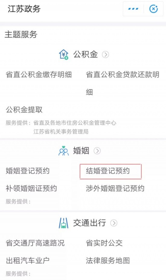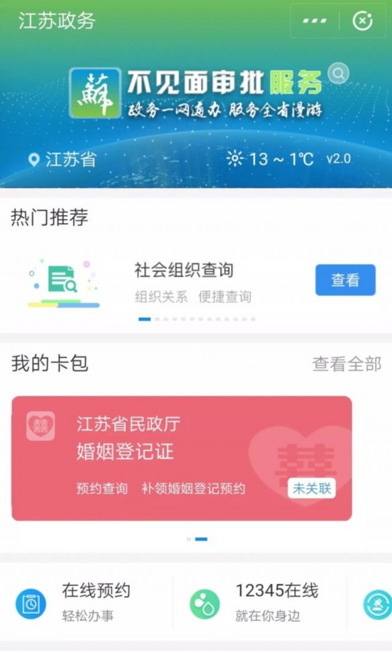 打开支付宝后,搜索“江苏政务”小程序,在“我的卡包”里就可以看到“江苏省民政厅婚姻登记证”卡片,通过相关认证进入页面后,页面上就会出现“结婚登记预约”。