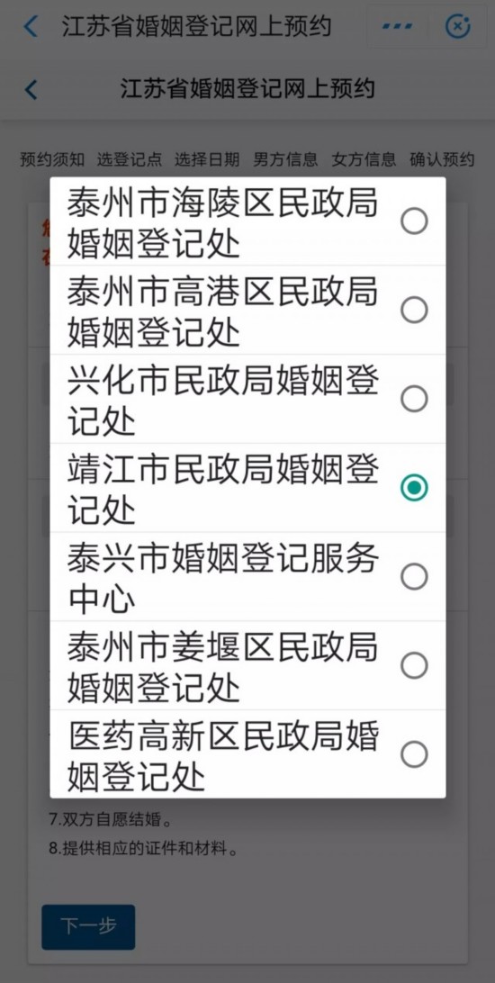 进入应用后选择“泰州市”、“靖江市民政局婚姻登记处”,按照流程指示,选择登记时间段,填写好双方信息,就可预约成功。