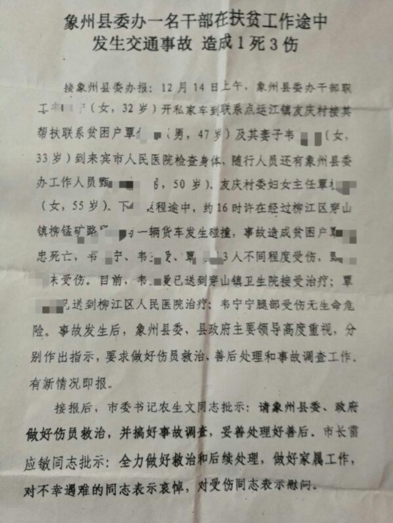 昨日,一份交通事故情况说明流传网络。说明称,接象州县委办报,12月14日上午,象州县委办干部职工韦某宁开私家车到联系点运江镇友庆村接其帮扶联系贫困户覃某忠及其妻子韦某爱到来宾市人民医院检查身体,随行人员还有象州县委办工作人员甄某、友庆村委妇女主任覃某。下午返程途中,约16时许在经过柳江区穿山镇柳锰矿路段时与一辆货车发生碰撞,事故造成贫困户覃某忠死亡,韦某宁、韦某爱、覃某3人不同程度受伤,甄某未受伤。目前伤者已送医院治疗,韦某宁腿部受伤无生命危险。