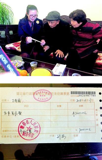 11月20日,丁有国悄悄地给蕲春县人民医院寄出了一封还债信。在得知蕲春县人民医院工作人员来的前一晚,老人坚持自己去银行取回7000元现金,叠得整整齐齐,用信封装好。