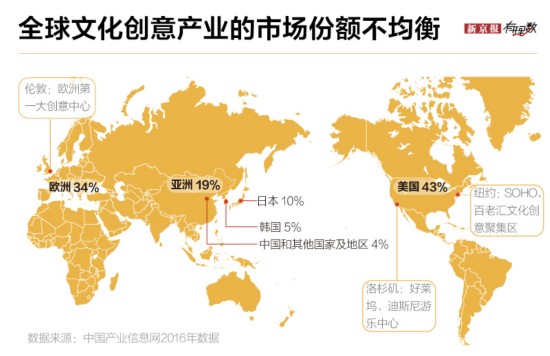 文化IP的竞争向来不均。美国输出英雄,日本制作动漫,韩国培养偶像。而中国在国际上的代表作似乎乏善可陈。据中国产业信息网统计,在全球文化创意(以下简称文创)产业分布中,美国以43%的市场份额独占鳌头,其次是以英国为核心的欧洲占34%,而亚洲仅占19%:其中日本占10%,韩国占5%,中国和其他国家及地区只占4%。