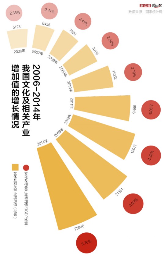先行者在文创产业道路上一骑绝尘,中国正快马加鞭地赶上。国家统计局的数据表明,总体来看,从2013年到2017年,我国文化及相关产业增加值占GDP的比重不断上升,从2013年的3.63%,到2016年突破4%,再到2017年占比4.20%,达到34722亿元。而创意设计服务在文化及相关产业中的占比也持续升高,从2014年的17.2%,到2015年的18.2%,直到2016年达到19%。