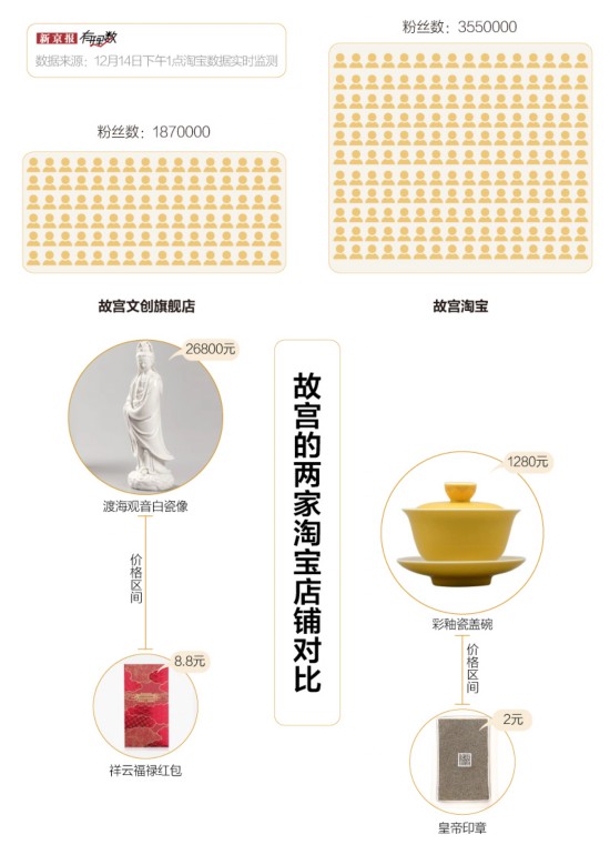 价格是年轻人可承受的。比起文创旗舰店以8.8元的祥云福禄红包起步和以近2万7的观音白瓷像触顶,故宫淘宝最低廉的产品是2元的皇帝印章,最昂贵的是1280元的仿康熙黄釉瓷盖碗。此外,文创旗舰店百元以下产品仅有111件,故宫淘宝百元以下产品则有220件。粉丝数量诚实地反映了这一点:故宫博物馆文创旗舰店的粉丝数187万,故宫淘宝则是355万。