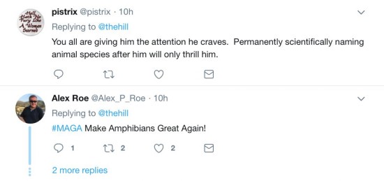 还有网友称,“你们正在给他所想要的关注度。永久性的以他的名字命名一种动物种类只会让他感到兴奋!”