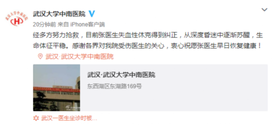 12月20日,武汉大学中南医院官方微博发布消息,经多方努力抢救,目前张医生失血性休克得到纠正,从深度昏迷中逐渐苏醒,生命体征平稳。