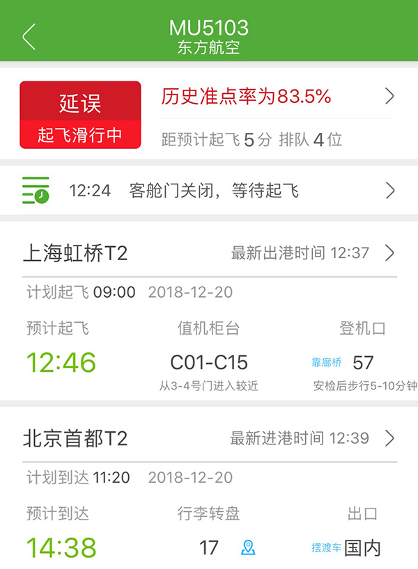 记者查询“航旅纵横”看到,MU5103航班原定于12月20日9时从上海虹桥机场飞往北京首都机场,计划到达时间为11时20分。现预计起飞时间已延后至12时34分,预计到达时间为14时26分。原执飞该航班的机型为空客330-343,机龄为3.4年,飞行时长2281.4小时,超过14%近一年中国民航运营客机。现执飞该航班的机型仍为空客330-343X,机龄4.3年,飞行时长2714.3小时,超过27%近一年中国民航运营客机。