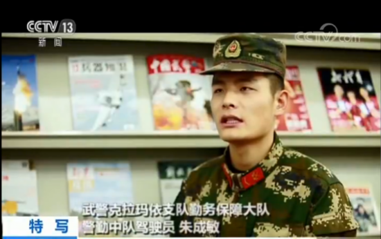 武警克拉玛依支队勤务保障大队警勤中队驾驶员 朱成敏: 风刮起的石子就跟机关枪一样砸在我们的装甲车上,根本什么都看不见,我们只能靠平时驾驶的技能,根据路边的白石线和中间那个淡淡的虚线判断路面,然后缓缓地向前进。当时晚上非常的寒冷,在零下17度左右。然后我就想到那十几名被困群众在寒风中,如果我们晚到一秒,那些上面被困群众生命就会多一秒危险。