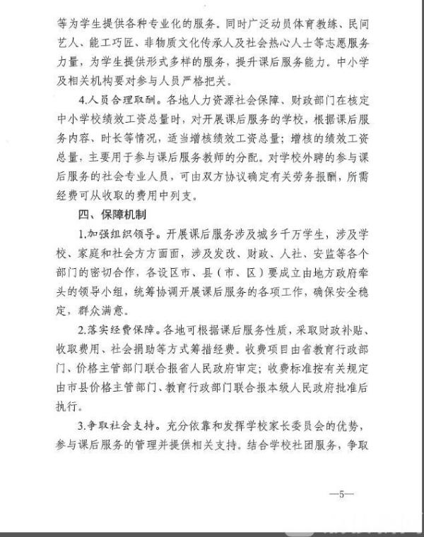 要求各地落实经费保障,可根据课后服务性质,采取财政补贴、收取费用、社会捐助等方式筹措经费。收费项目由省教育行政部门、价格主管部门联合报省人民政府审定;收费标准按有关规定由市县价格主管部门、教育行政部门联合报本级人民政府批准后执行。