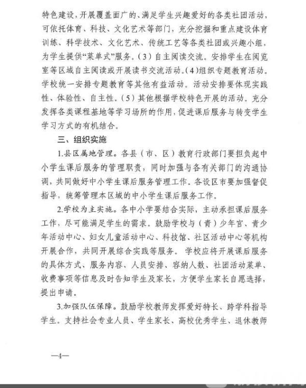省教育厅18日发文,对我省中小学课后服务提出指导意见。意见提到,小学和初中课后服务不晚于18:00,家长自愿申请,财政补贴,可适当收费。