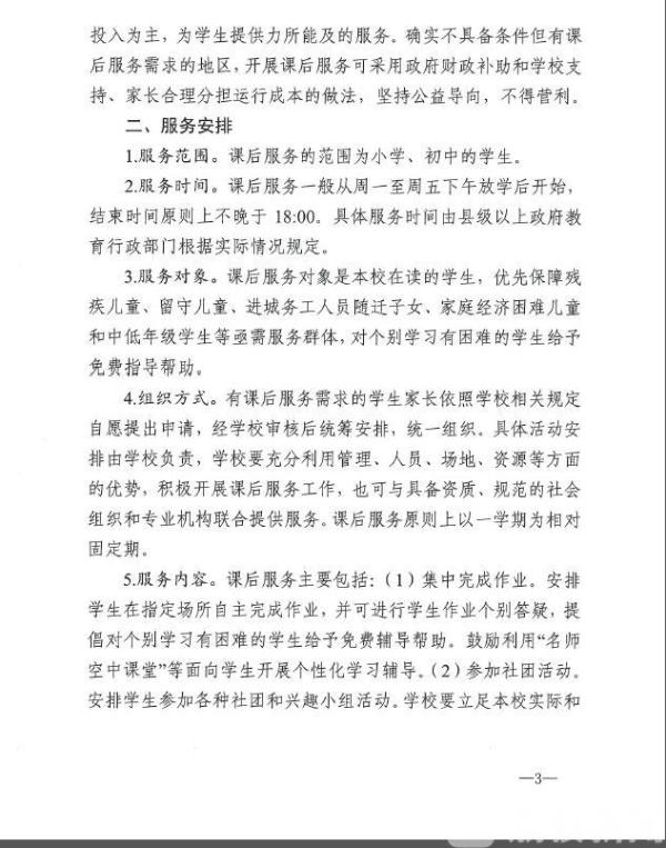 文件明确课后服务的范围为小学、初中的学生;服务时间一般从周一至周五下午放学后开始,结束时间原则上不晚于18:00。