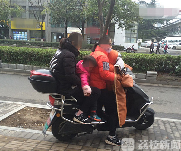 现场发现,该电动车一共乘坐了4个人,2个成年女子,2个未成年人,其中一个小孩站着电动车的踏板上,另外一个小孩则夹在两个成年女子中间。根据《南京市道路交通安全条例》规定,驾驶自行车、电动自行车在城区道路上行驶,只能载一名12岁以下的儿童,不允许载成年人,也不能多载未成年人。